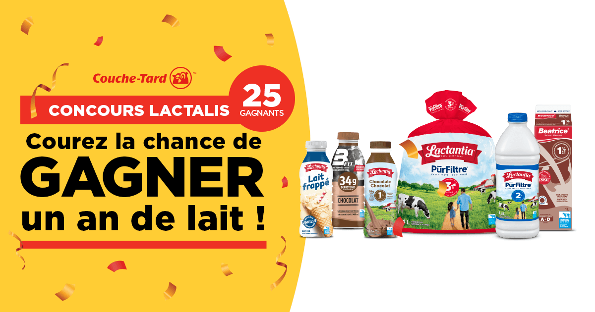 Courez la chance de gagner un an de lait de Lactalis®! 'Il vous suffit d'acheter un produit Beatrice®, B-Fit®, Enjoy® ou Lactantia® chez Couche-Tard, de conserver votre reçu, puis de balayer ou d’entrer le NIP afin de courir la chance de gagner l’un des 25 prix offerts (valeur de 1000 $ CAD chacun) !